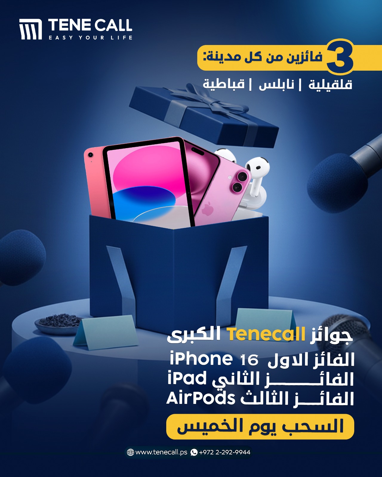 تَينكول للدعاية والإعلان، بالتعاون مع الشركاء ادناه، يقدمان سحباً محلياً حقيقياً لأهالي ، قباطية، نابلس، وقلقلية ولا تفوّت فرصتك بربح احدى الجوائز ايفون 16 ايباد وايربودز